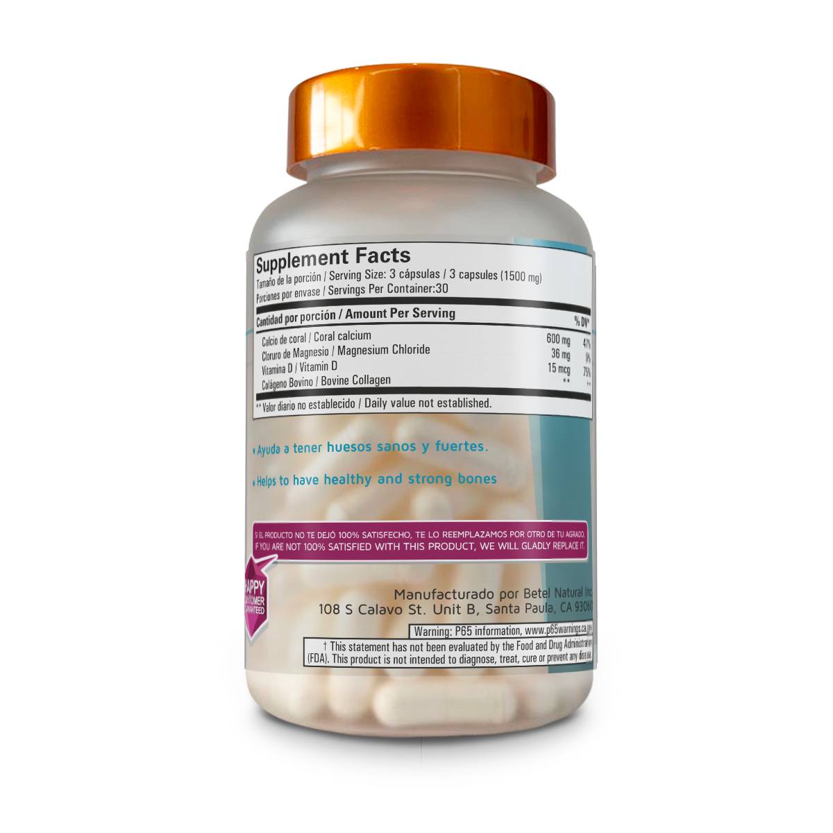 Huesos y Músculos Fuertes: El Calcio de Coral Cápsulas de Betel Natural es esencial para el mantenimiento de huesos fuertes y saludables, promoviendo una correcta mineralización ósea y ayudando a prevenir la pérdida de densidad ósea. Además, apoya la salud muscular, favoreciendo la función muscular adecuada y reduciendo el riesgo de calambres. 🦴💪