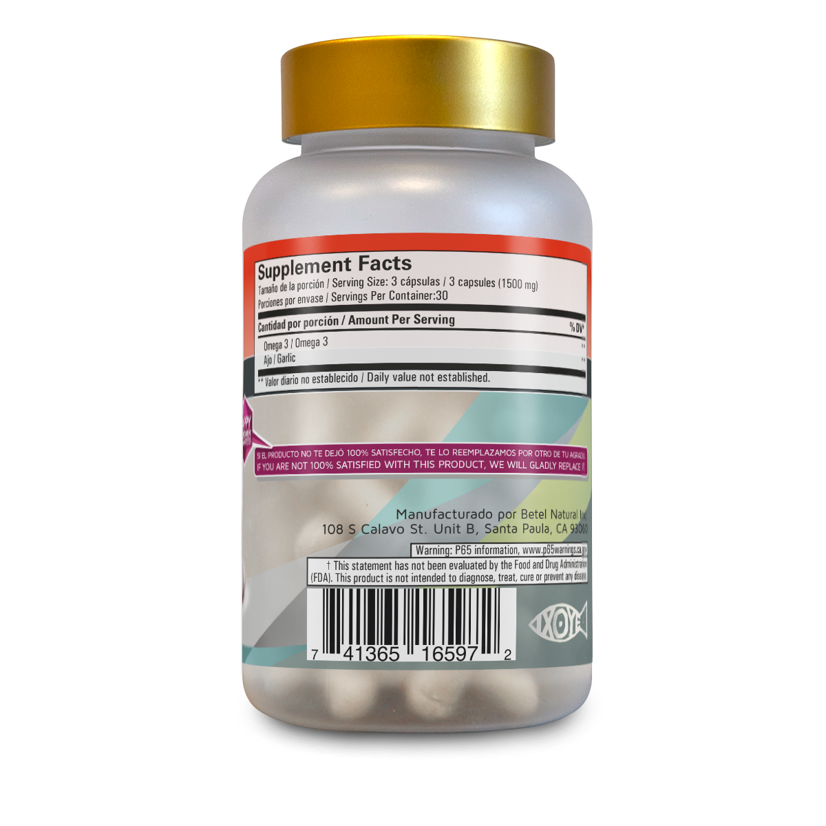 La grasa «buena» conocida como Omega 3, combinada con las excepcionales propiedades del ajo, ha dado como resultado el mejor tratamiento natural para las personas que sufren de alta presión, arteriosclerosis, colesterol y triglicéridos elevados.