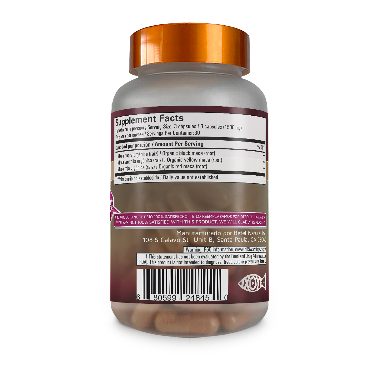 Este suplemento está hecho con maca negra, amarilla y roja, cultivadas de manera orgánica, garantizando una calidad y pureza excepcionales en cada cápsula. 🍃🌍